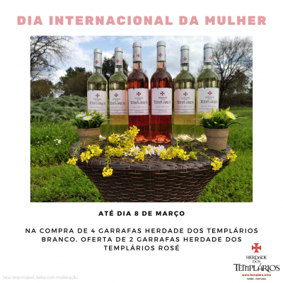 Para este dia comemorar, oferecemos 2 garrafas para brindar! 🍷 Na compra de 4 Garrafas Herdade dos Templários Branco, oferecemos 2 Garrafas Herdade dos Templários Rosé 🍷 Promoção válida de 03/03/2021 a 08/03/2021.