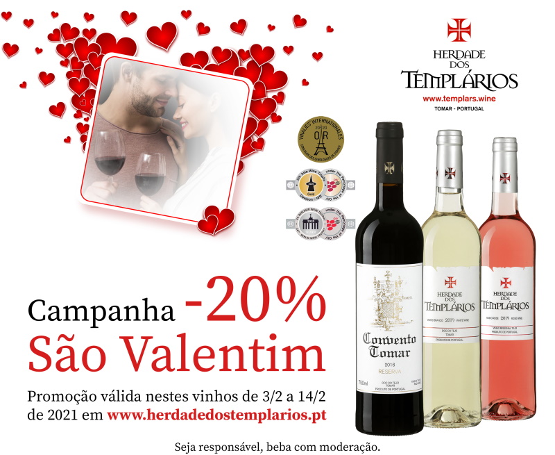 Tinto, branco ou rosé, este ano celebre o Dia de São Valentim em casa e aproveite até ao dia 14 de Fevereiro a promoção de 20% na nossa loja online nos vinhos Convento de Tomar tinto, Herdade dos Templários branco e Herdade dos Templários rosé!
